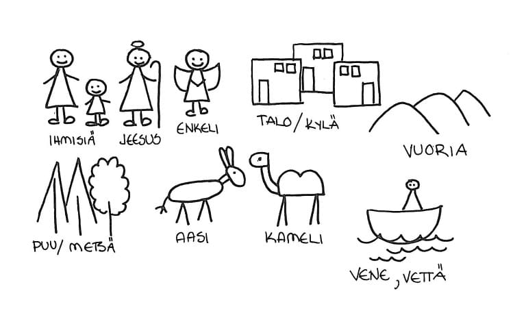 Ajattelet ehkä, ettet osaa piirtää, mutta olen varma, että jokainen osaa tehdä neliön, kolmion, ympyrän ja erilaisia viivoja. Näitä yksinkertaisia muotoja käyttämällä selviytyy jo pitkälle. Katso alla olevia esimerkkejä, eiväthän ne ole vaikeita. Mieti raamattukertomus, harjoittele ja käytä. Piirtämiseen tarvitaan vain rohkeutta! Kun vielä teet kuvasi mahdollisimman suureksi, etkä piirrä paperille liikaa asiaa, uskon että onnistut.