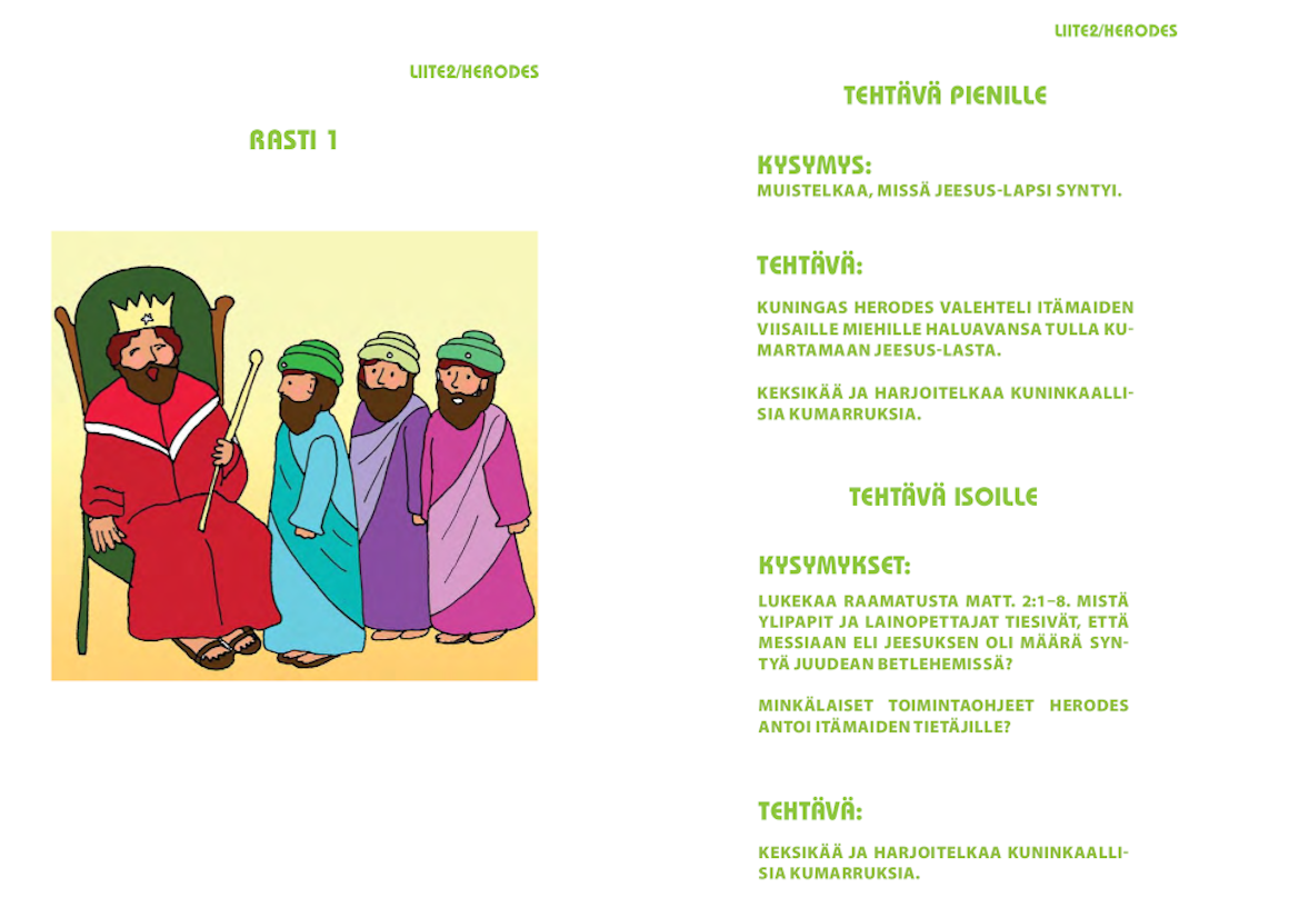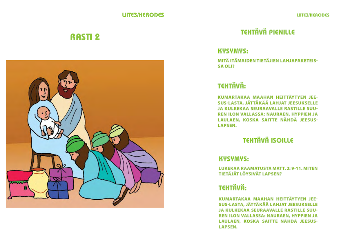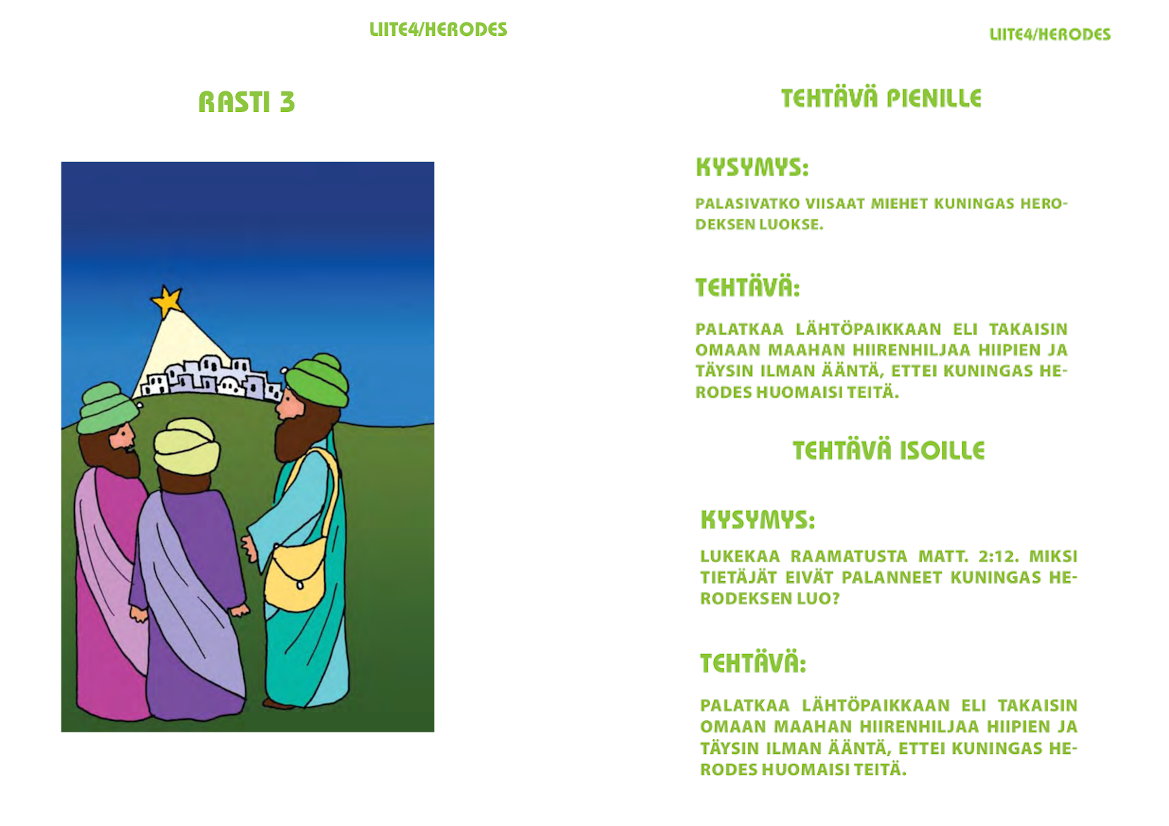Ohjaaja kertoo leikkijöille, että jokainen ryhmän jäsen on itäisen maan viisas mies. Heidän tehtävänään on viedä hienoja lahjoja: kultaa, mirhaa ja suitsuketta, juuri syntyneelle kuninkaalle. Jokaiselle leikkijälle annetaan oma lahja. Ryhmät lähtevät järjestyksessä radalle. Ohjaaja lähettää seuraavan ryhmän, kun edellinen ryhmä on selvittänyt ensimmäisen rastin. Kaikki rastit selvitettyään ryhmä palaa takaisin lähtöpaikalle, jossa tehtävät tarkistetaan yhdessä. Jos leikkiä leikitään pienten kanssa, jokaisella rastilla olisi hyvä olla ohjaaja, joka auttaa lapsia ja kertoo heille rastin ohjeet. Ohjaaja voi olla piilossa, jotta lapset saavat etsiä itse tähden. Isommat leikkijät selviävät itsekin, ja heillä tulee olla mukana Raamattu ja muistiinpanovälineet. Lähtö/maalipaikalla on kuva (LIITE1/HERODES). Kolmella rastilla on pahvitähti ja liitteinä 2-4 olevat kuvat, kysymykset ja tehtävät. Pienille ja isoille on omat kysymykset.