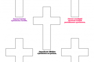 1. Jeesus kantoi syntimme ristille. Jos me kirjoittaisimme kaikki meidän pahat tekomme, sanamme ja ajatuksemme ensimmäiseen ristiin, se tulisi täyteen. Väritä ensimmäinen risti tumman violetilla/mustalla muistuttamaan meitä synneistämme.