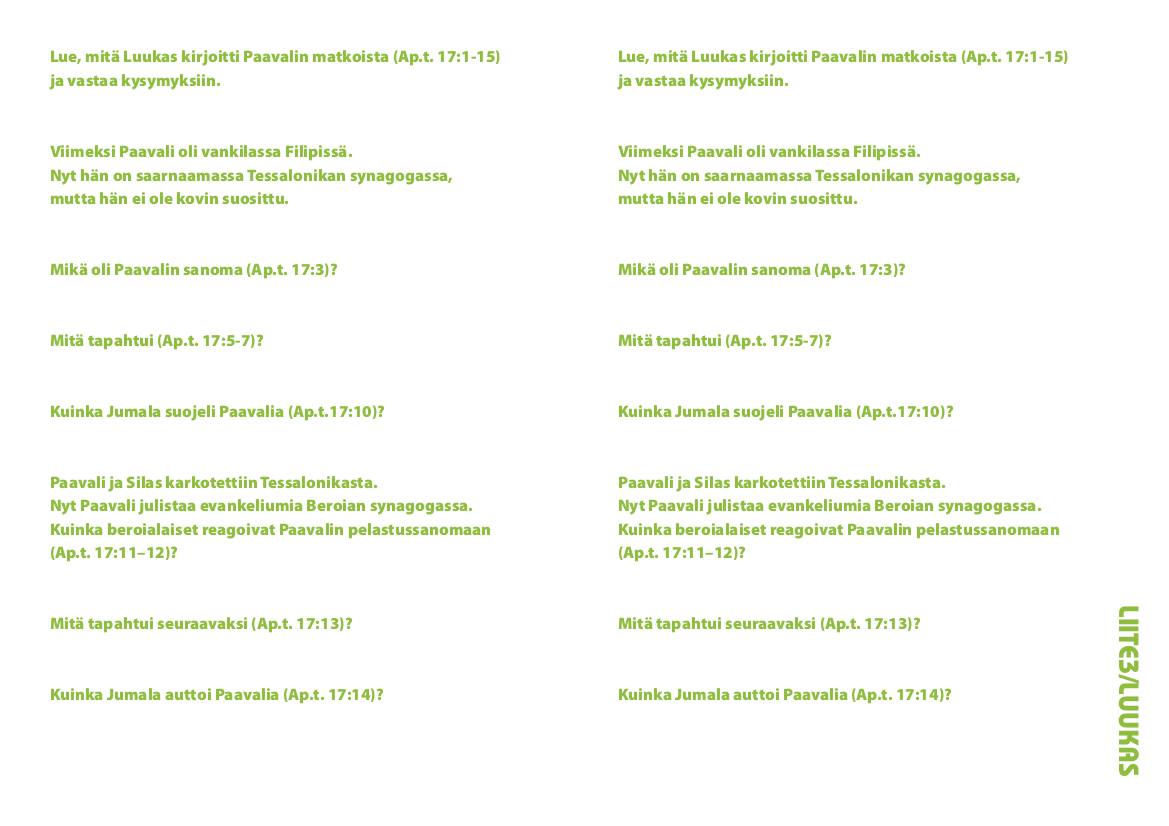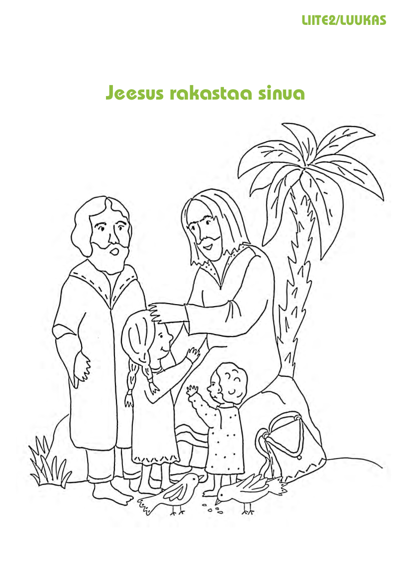 (Näytä lapsille Raamatusta Luukkaan kirjoittamat kirjat.) Jumalan Pyhä Henki auttoi Luukasta kirjoittamaan Jeesuksesta ja hänen elämästään. Jumalan Pyhä Henki pani Luukkaan kirjoittamaan, miten evankeliumi alkoi levitä kaikkialle maailmaan. Monta mielenkiintoista kertomusta ja tapausta saamme kuulla Luukkaan tallentamana.